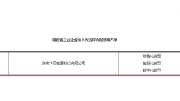 近日,湖南省工業(yè)和信息化廳正式公布湖南省工業(yè)企業(yè)技術改造綜合服務商入選名單,湖南華辰智通科技有限公司成功入選“綠色化轉型”、“智能化轉型”、“數字化轉型”三大類別服務商。